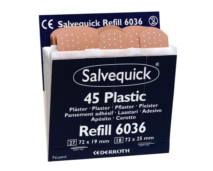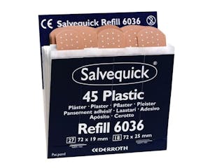 6 navullingen van 40 stuks (24 stuks 72 x 19 mm en 16 stuks 72 x 25 mm). Geschikt voor de Salvequick pleisterautomaat SALAUT