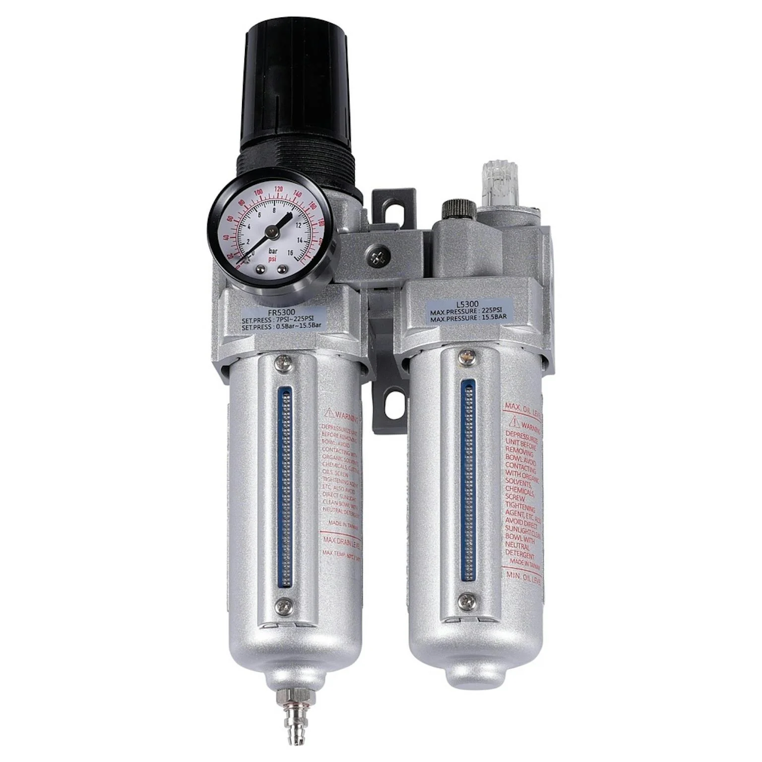 - Drukbereik van 0 tot 15.5 bar, waardoor deze luchtverzorgingsset geschikt is voor gebruik in combinatie met de meest voorkomende compressoren.