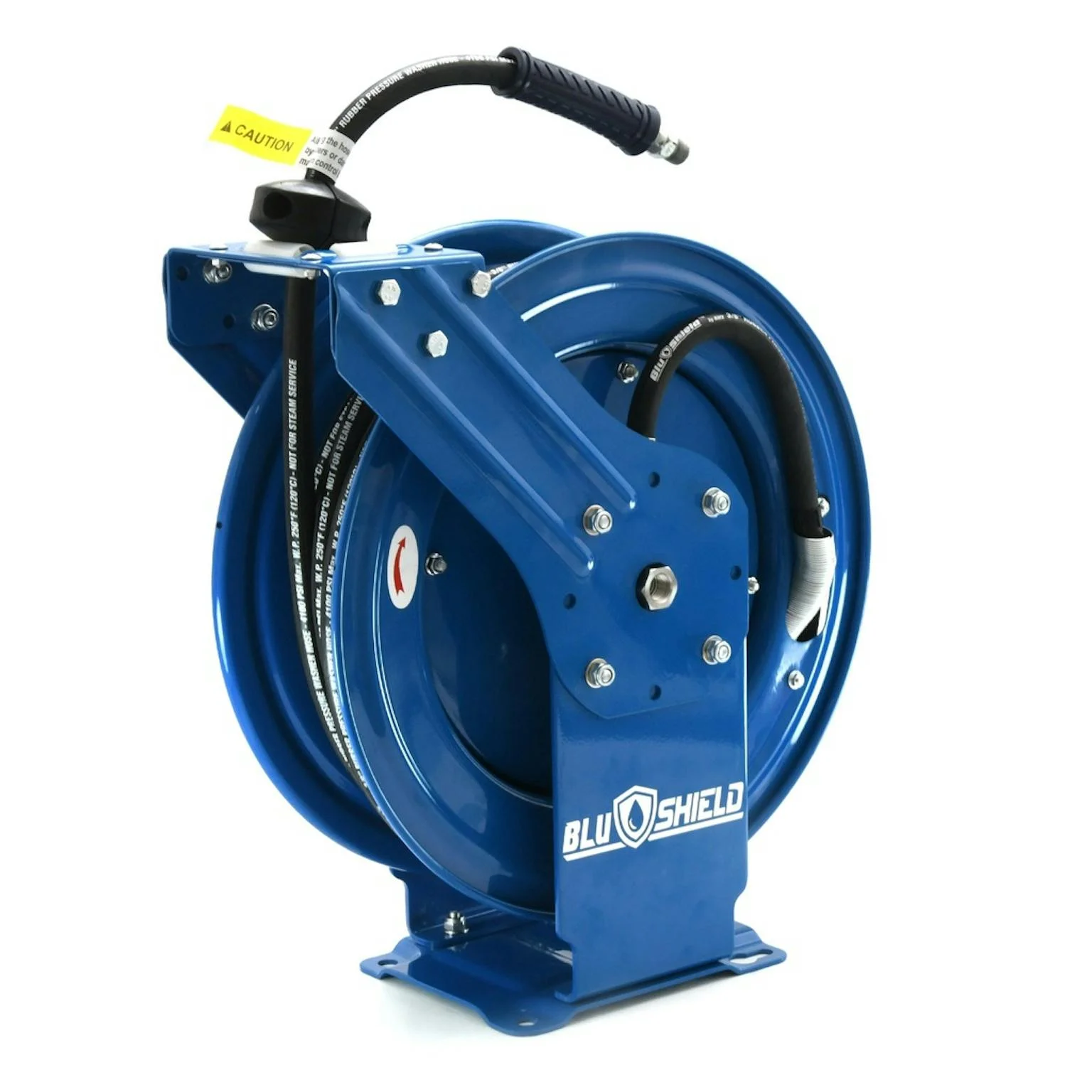 Blushield zware Hogedrukslanghaspel is gemaakt van poedergecoat 1.2 mm staal en heeft een ratelvergrendelingsmechanisme met 12 posities. Het wordt geleverd met de lichtste, sterkste, meest flexibele en met kevlar gevlochten drukspuitwasslang. Deze combinatie is perfect voor automotive en doe-het-zelf industrie. Het is een geweldig kosteneffectief alternatief voor motor aangedreven haspels.