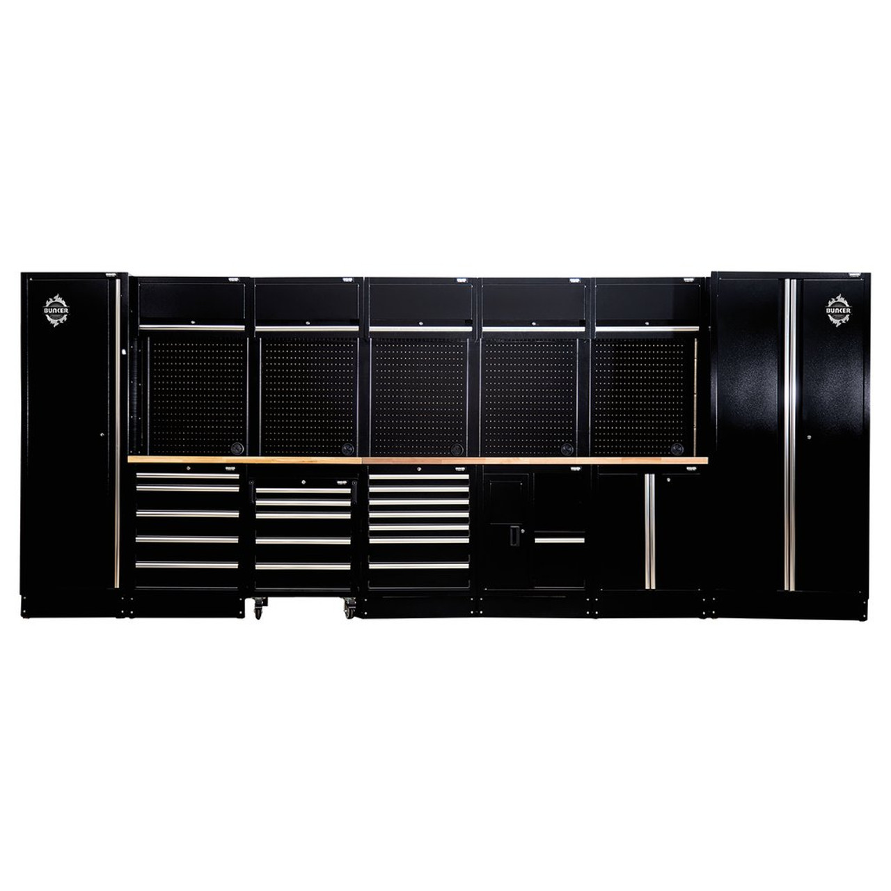 Onderdeel van het BUNKER® modulaire opbergsysteem. Deze verbluffend ontworpen combo kan eenvoudig in een garage of werkplaats worden geïnstalleerd om uw ideale opslagsysteem te creëren. Alle units zijn gemaakt van hoogwaardig staal en hebben een duurzame matzwarte gestructureerde industriële poedercoating. De vloerkasten zijn bedekt met een stijlvol hardhouten werkblad en bieden ongelooflijk veelzijdige opbergmogelijkheden, met grote kasten met volledig verstelbare planken en soepele, zachtsluitende lades bekleed met weelderig schuim om je gereedschap te beschermen. Er is ook een verrijdbare kast met vijf lades. De vaste onderkasten hebben verstelbare poten voor een optimale positionering op een ongelijke vloer. Alle bovenkasten hebben opklapbare deuren voor gemakkelijke toegang, bediend door fluisterstille gasdrukveren. Voor extra opbergruimte fungeren de achterpanelen als ophangborden en elk heeft een voorgesneden gat voor toegang tot een voeding. Elke unit heeft een integraal slot voor veiligheid en er worden twee sleutels meegeleverd. De combo wordt geleverd met alle benodigde fittingen voor een eenvoudige installatie. Voor uw kwaliteitsborging hebben alle BUNKER®-units een garantie van 10 jaar. Elke combo bevat een gratis magneet van het kenmerkende BUNKER®-logo.