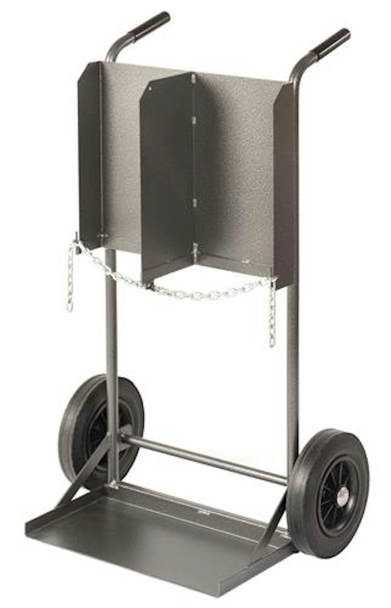 Cilinderwagen voor 2 cilinders van 20 liter. Uitgevoerd met gelagerde wielen Ø 250 mm en massief rubberen banden.
