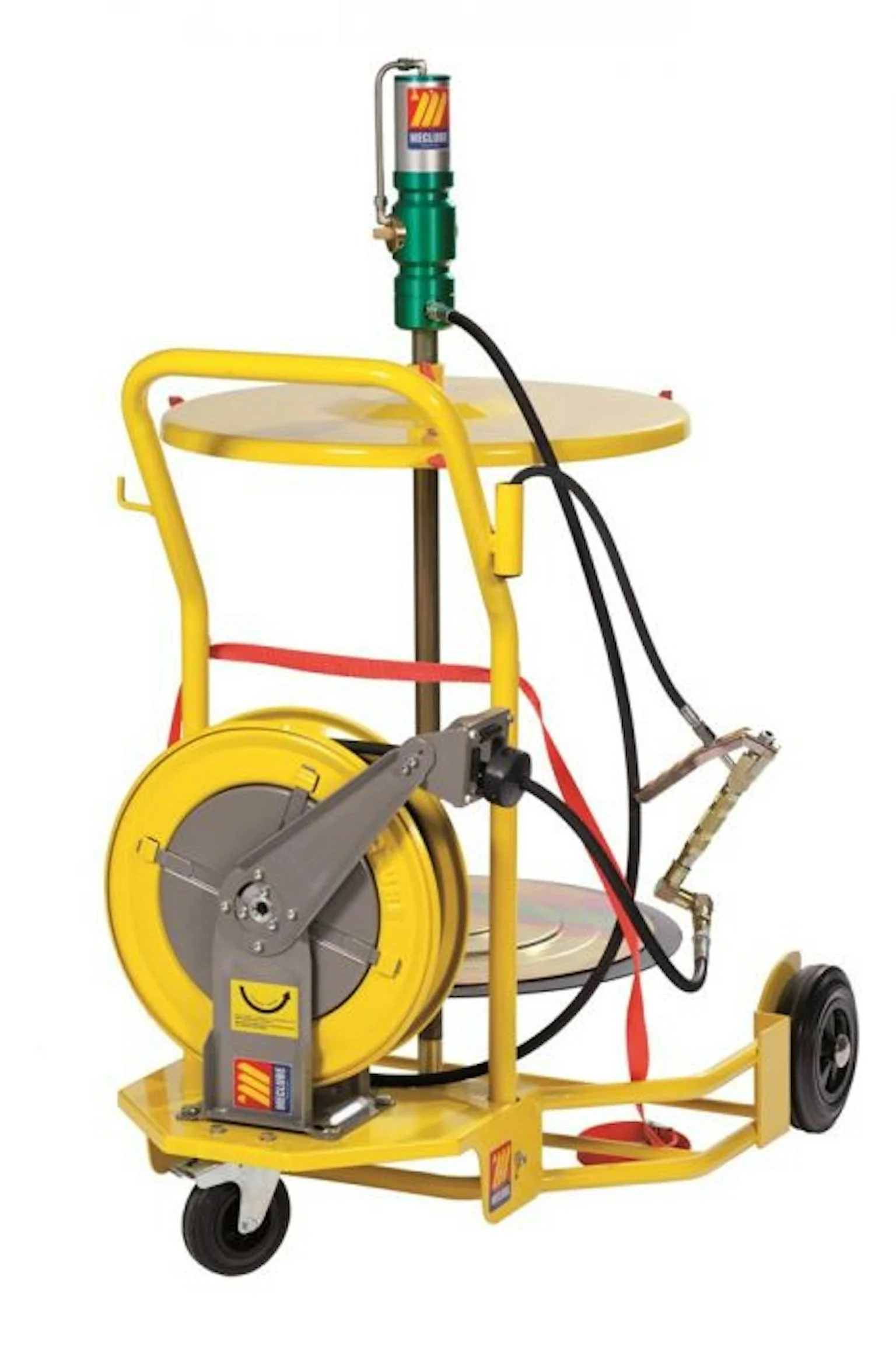 Luchtbediende vetpomp (compressie 60:1) met een handige trolley, slangveerhaspel, vulpistool met 10 meter slang en draaibare koppeling.