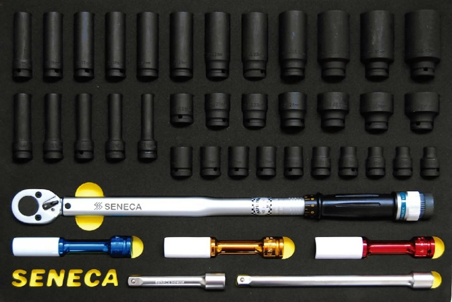 FOAM LADE VOOR GEREEDSCHAPSWAGEN NR 7Technische gegevens: - 17 impact doppen = 10, 11, 12, 13, 14, 15, 16, 17, 18, 19, 21, 22, 23, 24, 27, 30, 32 mm - 17 impact doppen lang =0, 11, 12, 13, 14, 15, 16, 17, 18, 19, 21, 22, 23, 27, 30, 32 mm - 3 teflon wieldoppen = 17, 19, 21 mm - 1 momentsleutel...