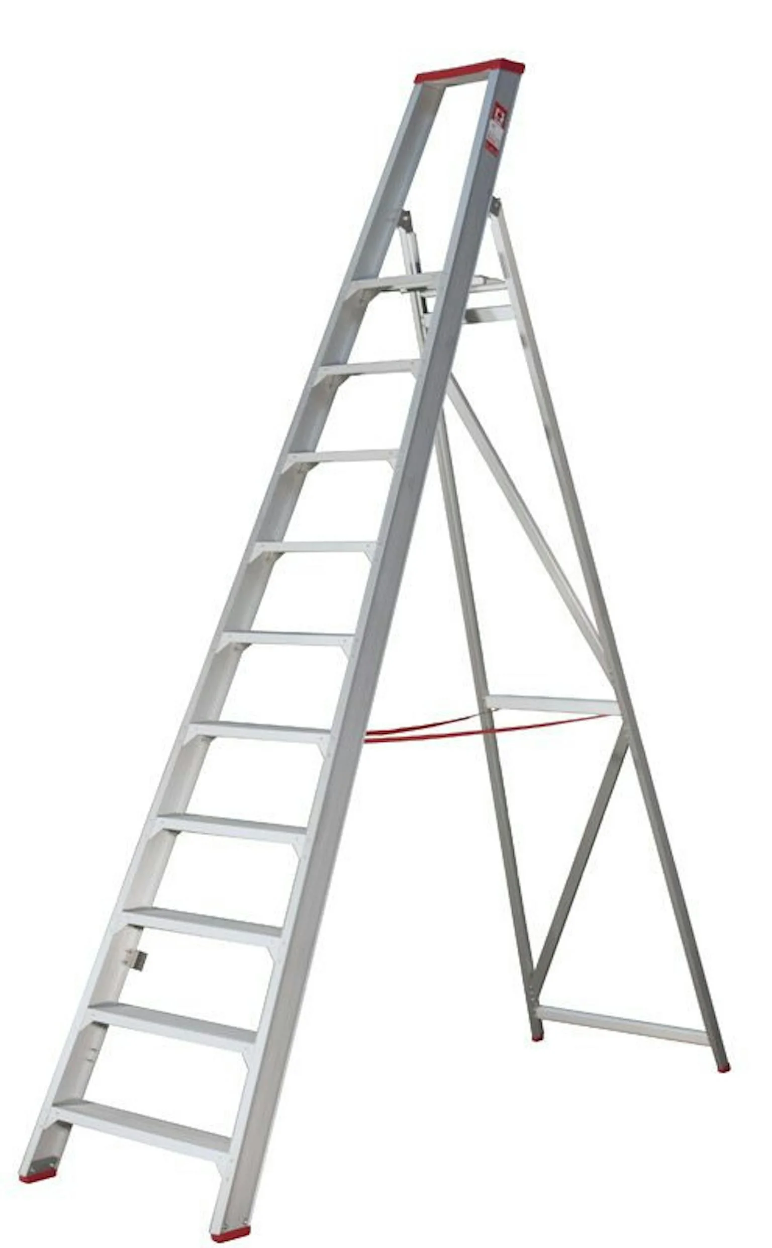 Oerdegelijke industrietrap met 4 schetsplaten en 12(!) popnagels in iedere trede. Het geanodiseerd aluminium is vuilafstotend en geeft niet af (geen vuile handen). De 10 cm diepe treden en het grote bordes zorgen voor een comfortabele werkplek.