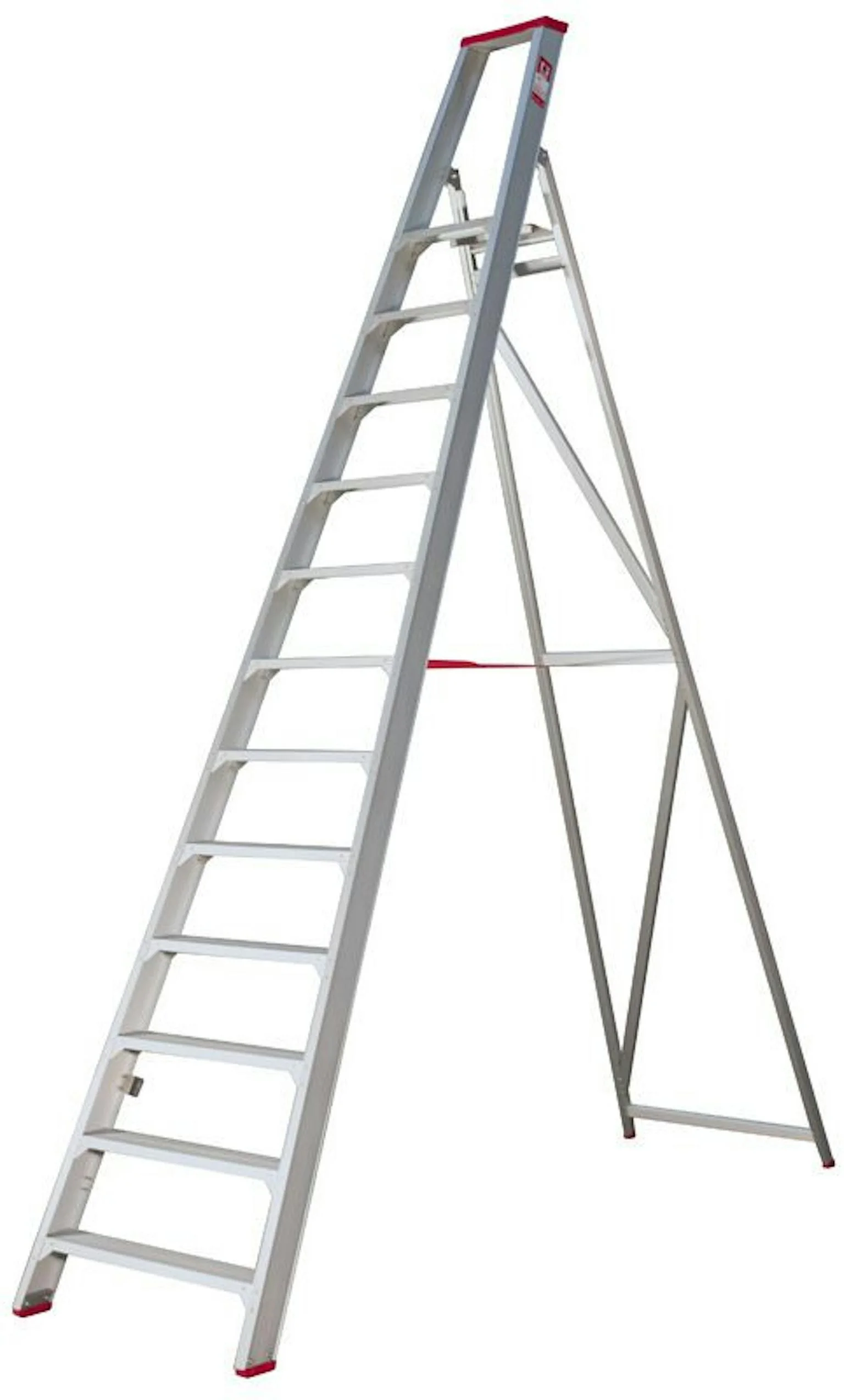 Oerdegelijke industrietrap met 4 schetsplaten en 12(!) popnagels in iedere trede. Het geanodiseerd aluminium is vuilafstotend en geeft niet af (geen vuile handen). De 10 cm diepe treden en het grote bordes zorgen voor een comfortabele werkplek.