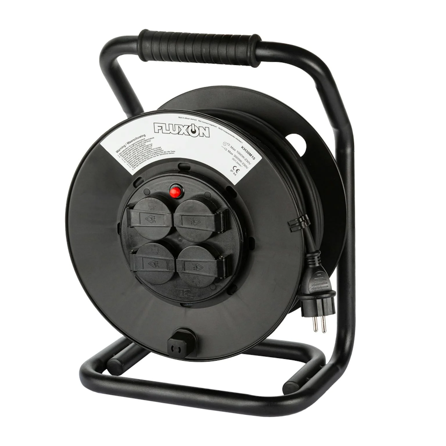 Stroomhaspel / verlengkabel / verlenghaspel / verlengsnoerZeer robuuste Fluxon verlengkabel met 4 stopcontacten inclusief thermische beveiliging.Uitgerust met vrij draaisysteem. Dus de stopcontacten draaien niet mee wanneer de kabelhaspel op of uitgerold wordt.Specificaties:neopreen kabel...