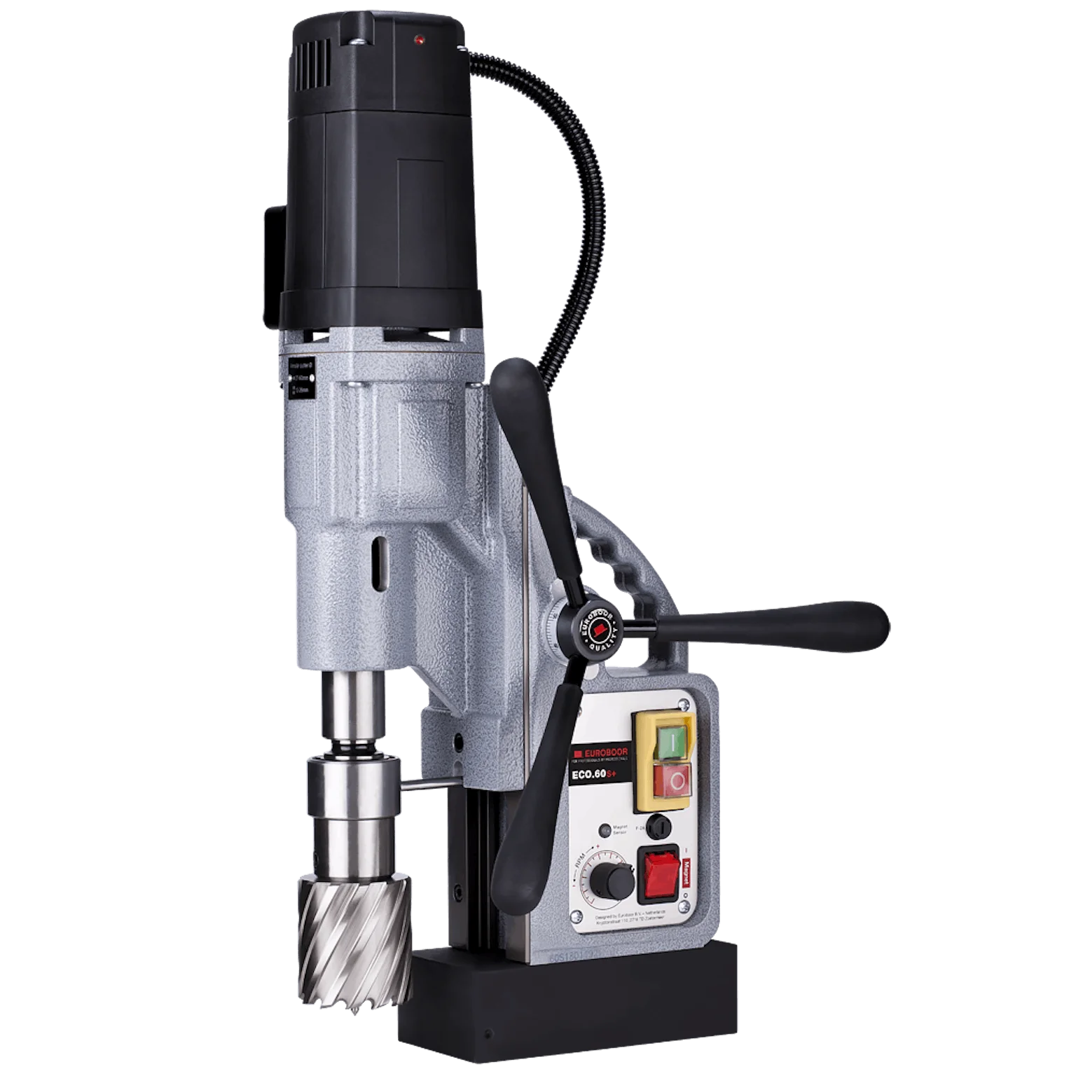 De Euroboor ECO.60S+ magneet kernboormachine heeft een krachtige 1.600 W (14,5 A) motor, olie gesmeerde versnellingsbak en oververhittingsbeveiliging. De draagbare industriële kernboormachine profiteert van innovatieve elektronica die nóg meer veiligheid bieden, zorgen voor een aanzienlijke vermindering van de risico’s op beschadiging van de machine, gereedschap en werkstuk én de gebruiker beschermen bij overmatige trillingen of plotselinge verplaatsing. De levensduur is aanzienlijk langer en hoge onderhoudskosten worden voorkomen.