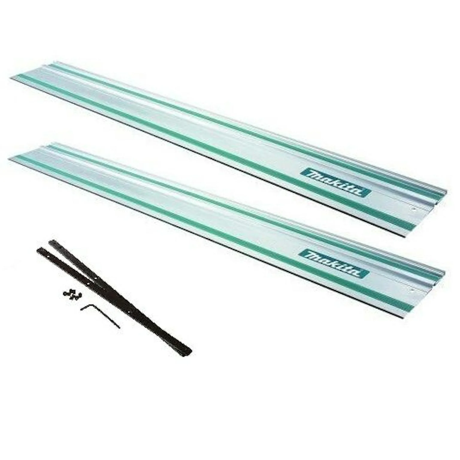 Koppelstripset compleet bestaande uit twee strips, inbusschroeven en een inbussleutel om de geleiderails aan elkaar te kunnen koppelen.
