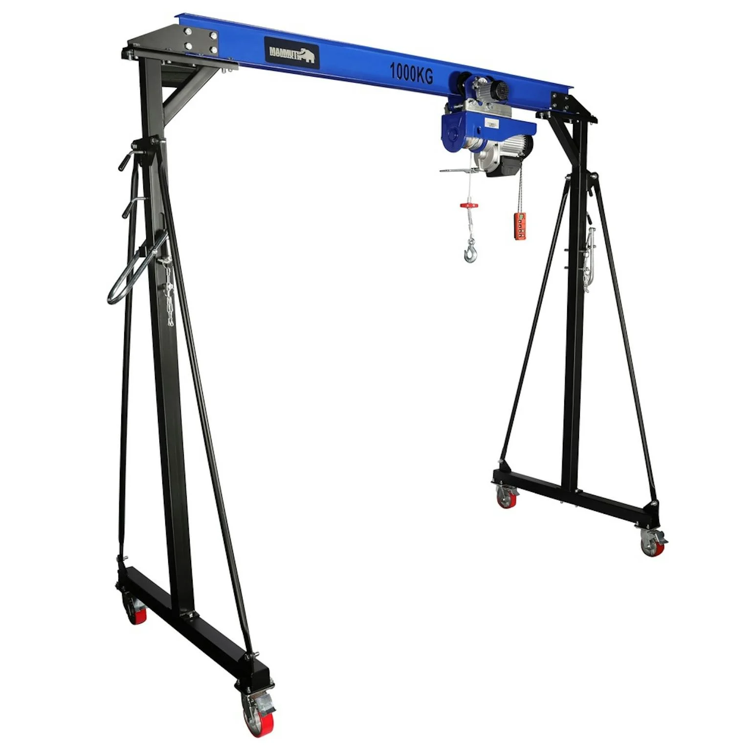 De Mammuth verrijdbare portaalkraan is geschikt voor het tillen en ondersteunen van lasten tot 1000 kg. Deze set is voorzien van een elektrische kabeltakel met geïntegreerde loopkat, beide draadloos te bedienen. Daarmee is de kraan direct inzetbaar en is de bediening comfortabel en efficiënt. Dankzij de verstelbare hoogte en brede doorgang is dit hulpmiddel veelzijdig toepasbaar in garages, werkplaatsen en industriële omgevingen.
