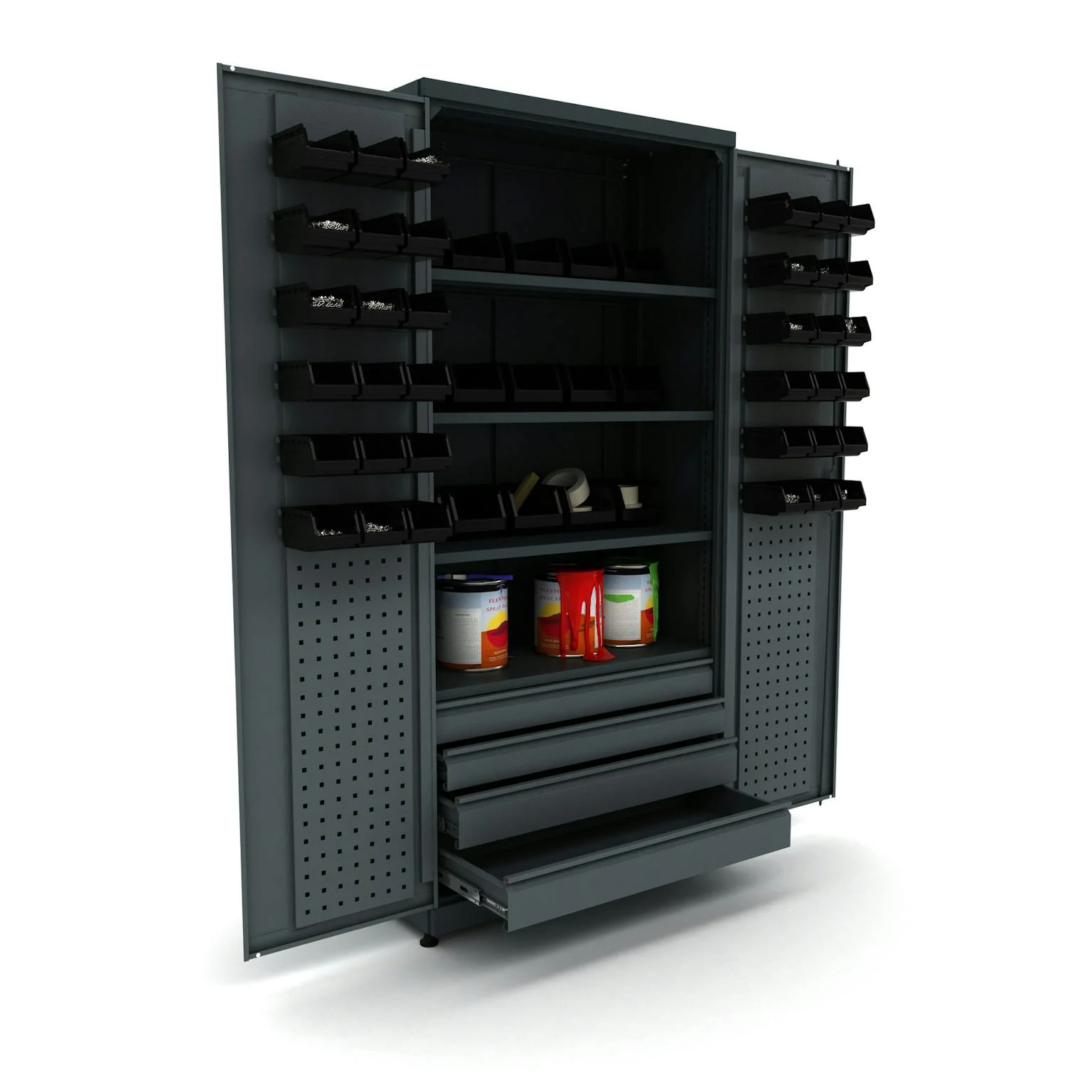 De kast heeft geperforeerde panelen in de deuren, zodat je gereedschap of andere accessoires binnen handbereik kunt ophangen. Boven de geperforeerde panelen kun je de opslagruimte maximaliseren door 36 kleine bakken op te hangen, die bij de kast worden geleverd, zodat je meest gebruikte gereedschap en accessoires gemakkelijk toegankelijk blijven.