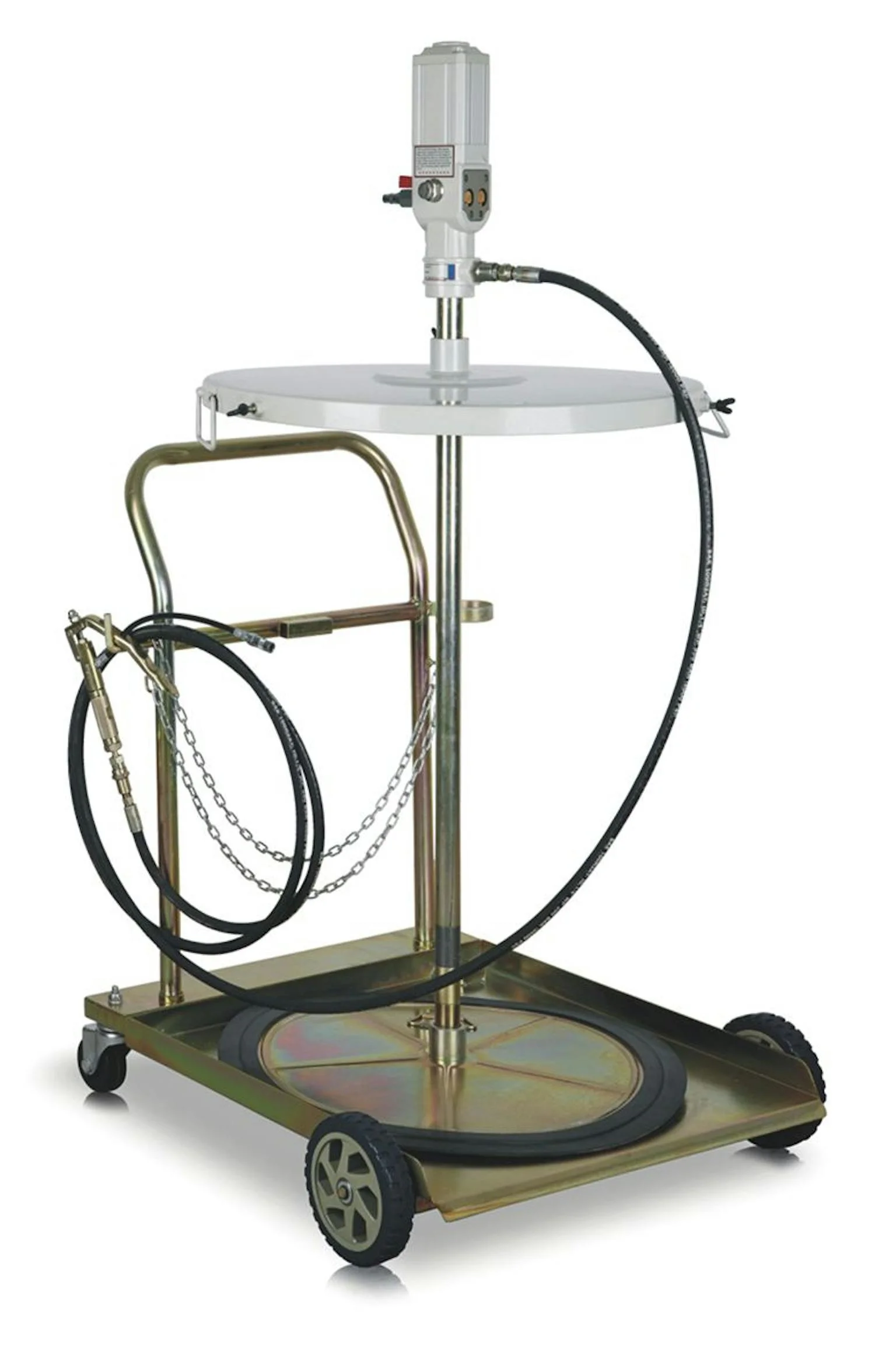 Vetpomp Robuuste trolley op 2 vaste wielen en 2 zwenkwielen Vatdeksel en volgplaat 540-580 mm 4 meter vetslang Vetpistool en Z-aansluiting