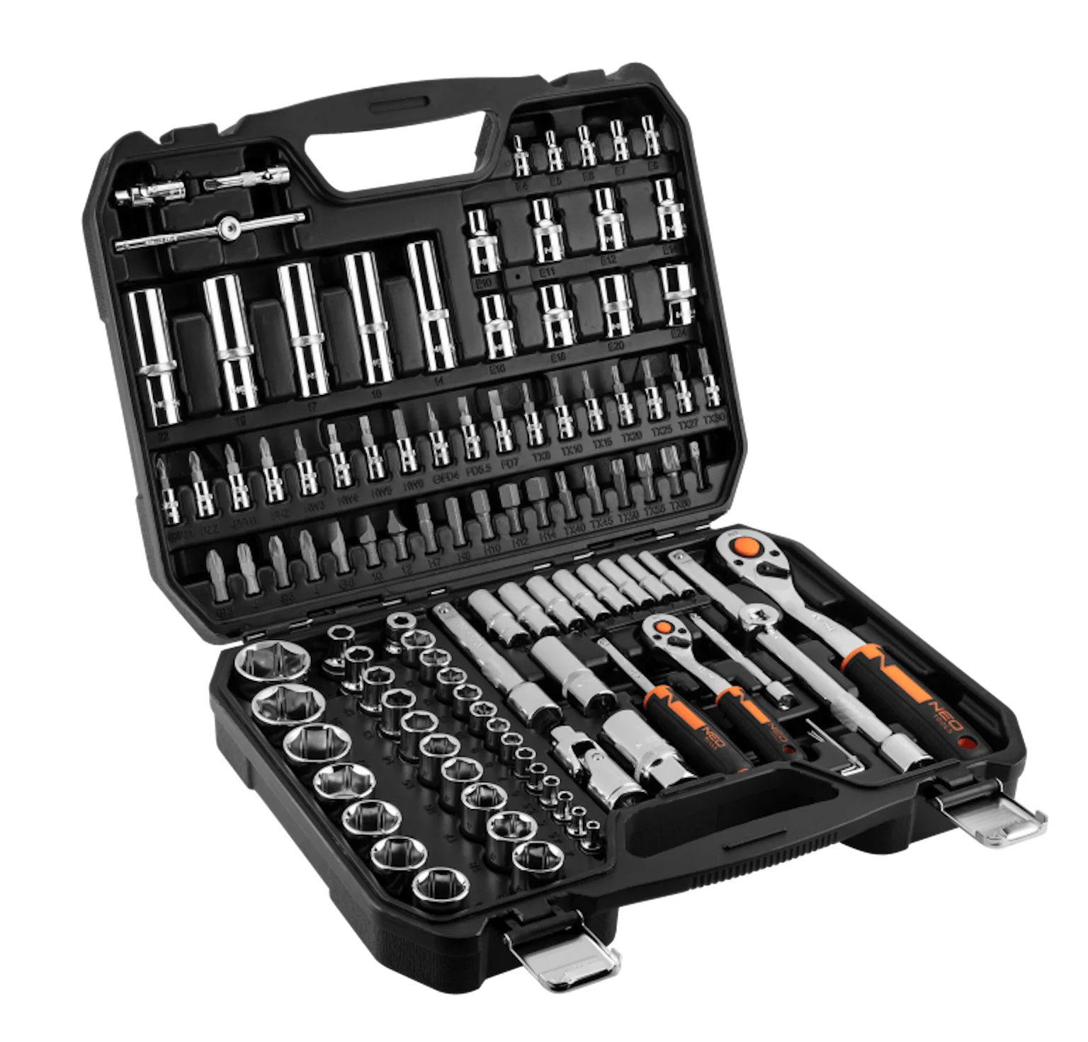 NEO dopsleutelset 1/2" en 1/4" (ref. nr. 10-066) bevat 110 stuks gemaakt van hoogwaardig chroom-vanadiumstaal. De set bevat 1/2" en 1/4" ratels. De set bevat een breed scala aan doppen (maat 4 tot 32 mm) en bits (plat, kruis, zeskant, Torx). Bovendien is de set uitgerust met een breed scala aan accessoires. Allemaal in praktische koffer. Productbetrouwbaarheid wordt bevestigd met 25 jaar garantie. Het merk NEO voldoet aan de verwachtingen van professionals.