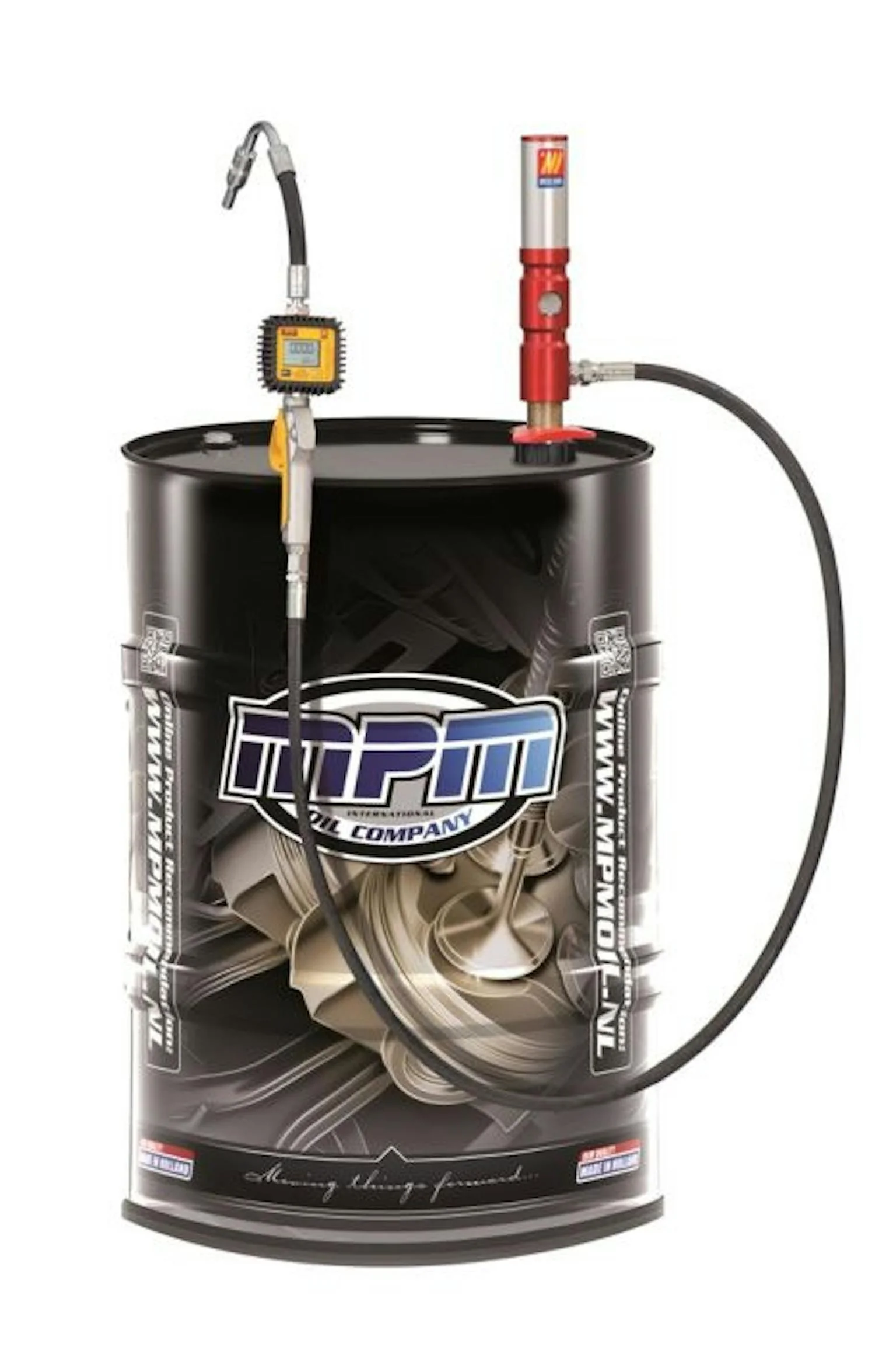 Luchtbediende oliepomp met digitale doorstroommeter.