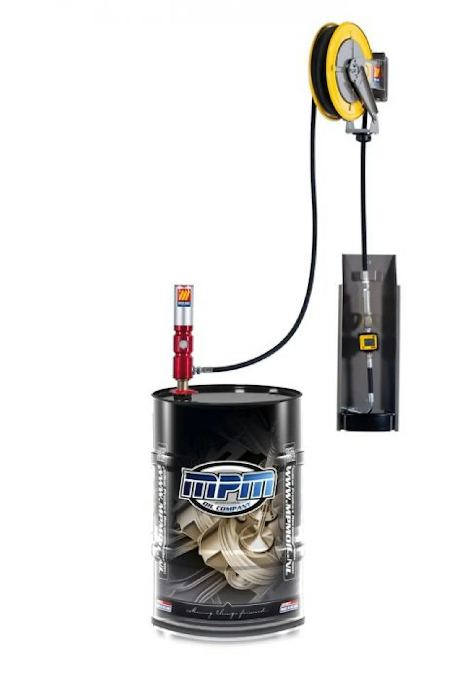 Luchtbediende oliepomp met slanghaspel, lekbak en digitale doorstroommeter. Voor bevestiging aan de muur.