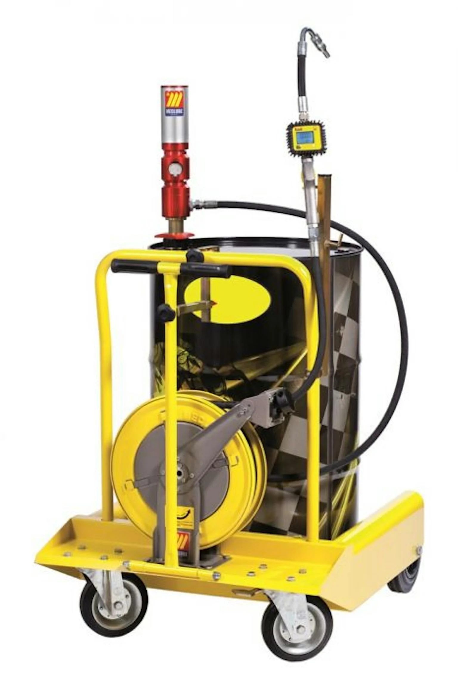 Mobiele luchtbediende oliepompset. Wordt geleverd met een digitaal afgiftepistool en slanghaspel.