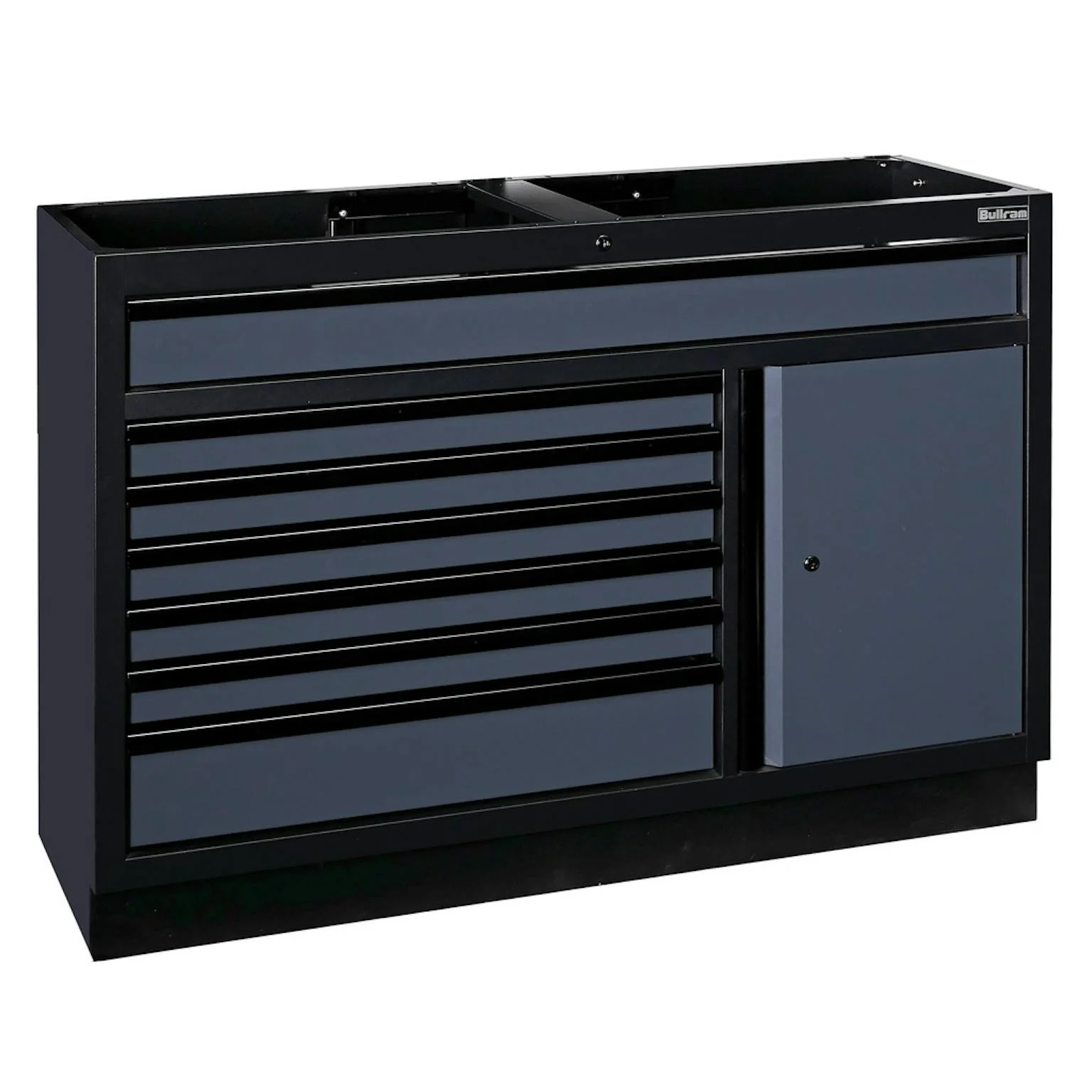 Deze brede onderkast van Bullram biedt een veelzijdige opbergoplossing voor de werkplaats, met 7 lades (1 lange en 6 korte) en een deur. Achter de deur bevinden zich 2 schappen voor extra opbergruimte. Deze kast is ideaal voor het organiseren van gereedschap en werkplekaccessoires. Het frame is uitgevoerd in RAL9005 (zwart), terwijl de lades zijn afgewerkt in RAL7021 (grijs).