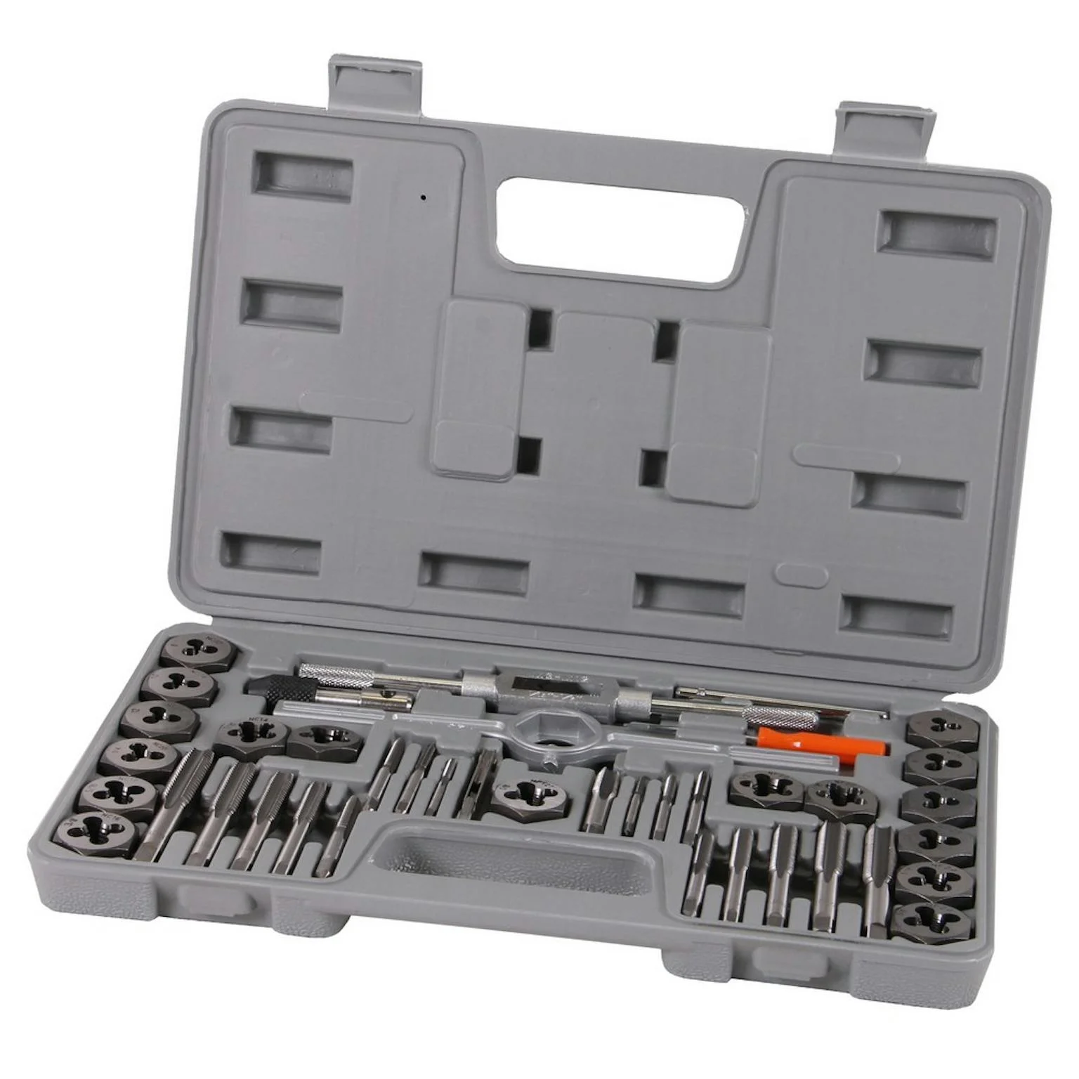 Tappenset engels Hooggelegeerd staal 17x snijkussens en 17x tappen: - 4 - 40 UNC- 6 - 32 UNC- 8 - 32UNC- 10 - 24 UNC- 10 - 32 UNC- 12 - 24 UNC- 1/4" 20 UNC- 1/4" 28 UNF- 5/16" 18 UNC- 5/16" 24 UNF- 3/8" 16 UNC- 3/8" 24 UNF- 7/16" 14 UNC- 7/16" 20 UNF- 1/2" 13 UNC- 1/2" 20 UNF- 1/8 NPT 27 - 1x...