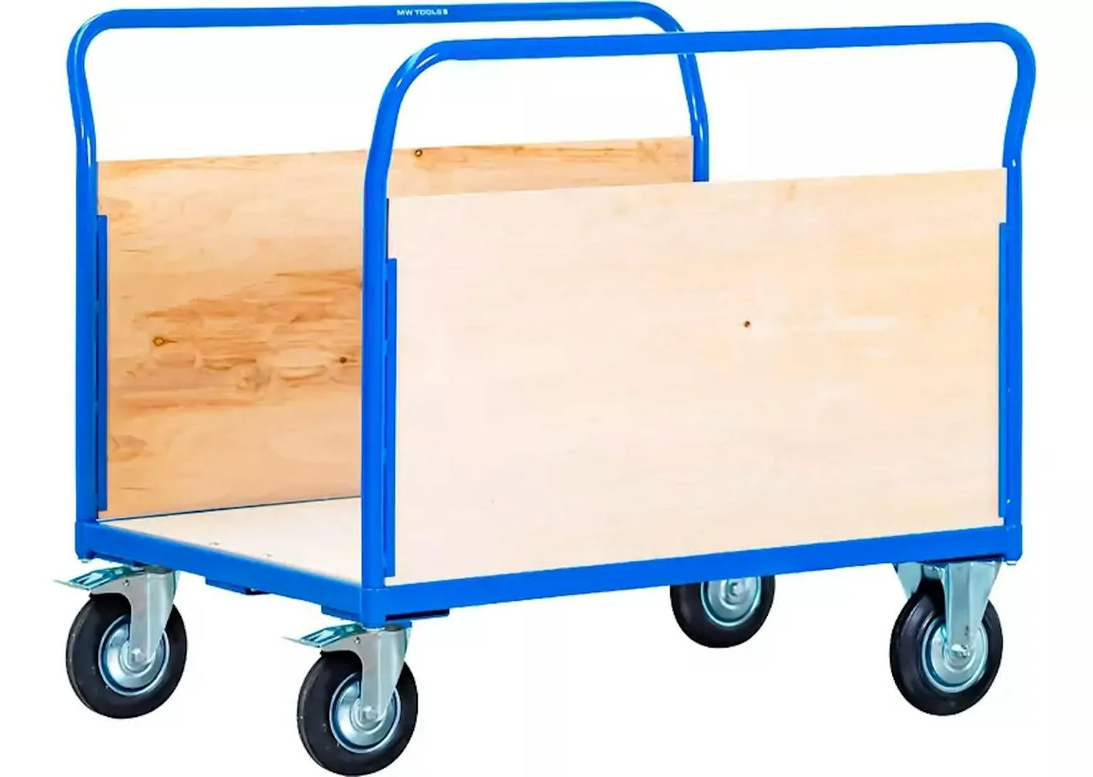 Systeem-transportwagen met 2 zijwanden.Kenmerken:Laadvlak: 1000 x 700 mmStaalbuisconstructie met poederlak afwerkingMultiplex legbordenCapaciteit van 500 kg – gelijkmatig verdeeld over de legbordenKleur blauw2 vaste wielen en 2 zwenkwielen met remNiet gemonteerd geleverd maar gemakkelijk zelf...