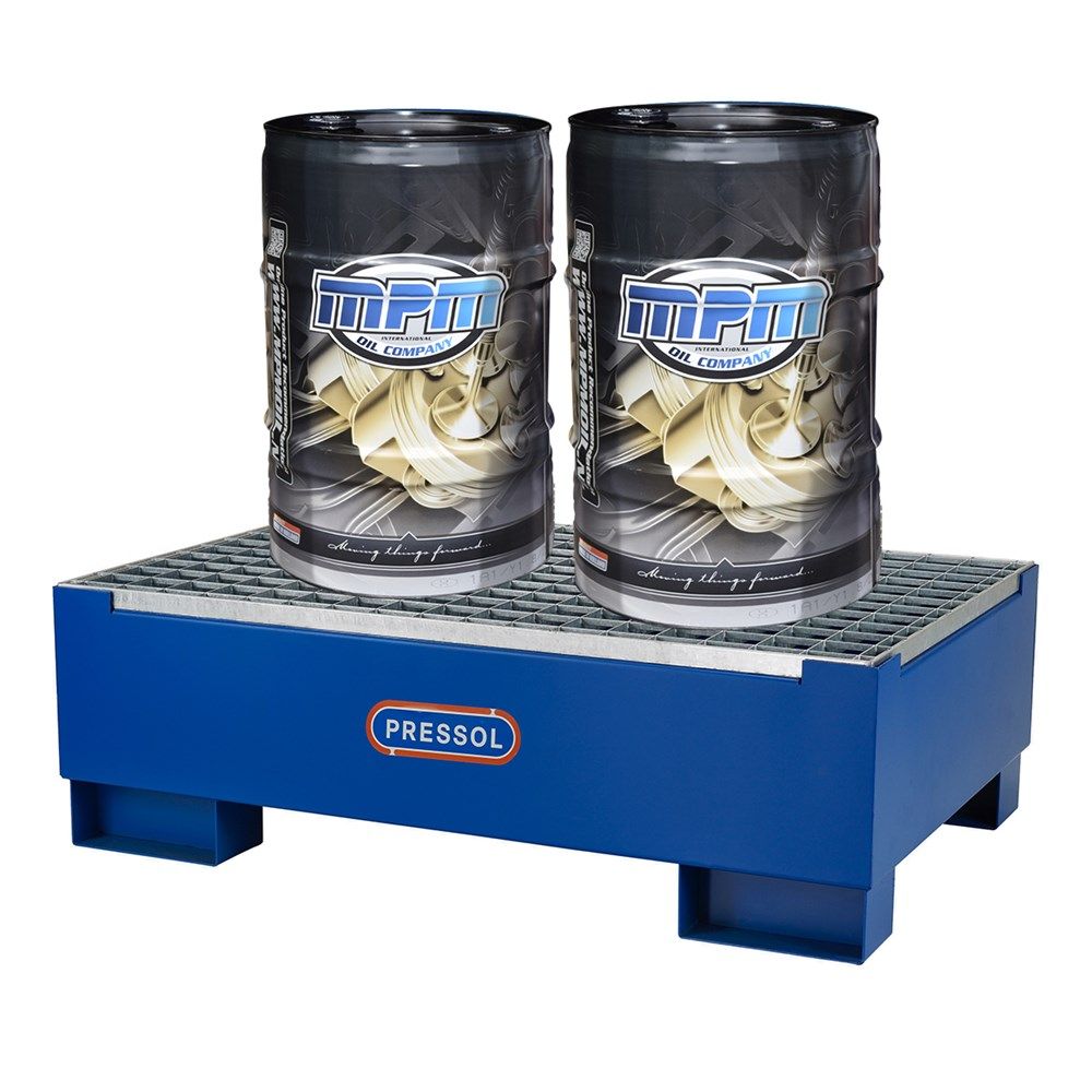 Kunststof opvangbak met gegalvaniseerd stalen rooster. Ideaal voor zuren, loog en olie.