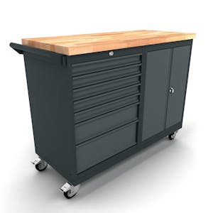 • De werkbank heeft een 2-deurs kast met een verstelbare plank erin, samen met twee extra kasten met 7 en 5 volledig uittrekbare lades, allemaal uitgerust met kogellagergeleiders, die voldoende opbergruimte bieden voor gereedschap, materialen en accessoires. Houd alles georganiseerd en binnen handbereik, voor minder stilstand en meer efficiëntie.