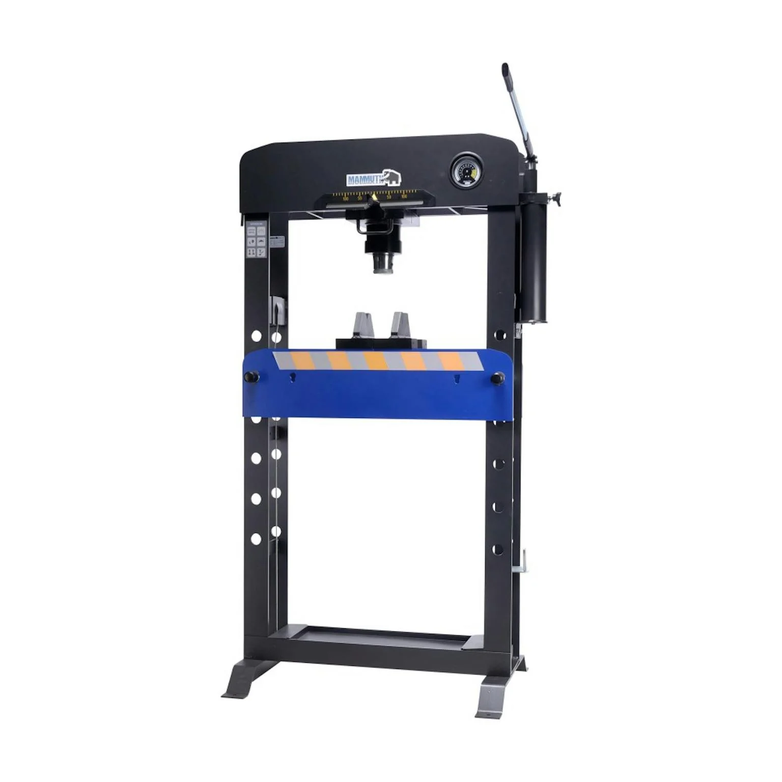 Deze Mammuth pers is uitermate geschikt voor het monteren van lagers, het inpersen van assen en bouten, het buigen van buizen en andere pers werkzaamheden waarbij grote kracht vereist is. De pers heeft een volledig gelast solide frame. Op de geïntegreerde manometer kan duidelijk de persdruk in kilogram afgelezen worden. De hydraulische cilinder is in de breedte (gelagerd) verplaatsbaar. Ook is de cilinder voorzien van een verwisselbare opname perskop en geïntegreerde hydraulische tweetrapspomp. Dit ingebouwde tweetraps systeem zorgt voor een grote slag bij lage tegendruk en een kleine controleerbare slag bij een hogere tegendruk, pers werkzaamheden kunnen zo gemakkelijk nauwkeurig uitgevoerd worden. Het werkbed is eenvoudig in hoogte te verstellen met behulp van de lier.